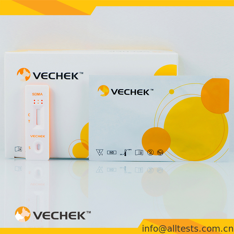 The Symmetric Dimethylarginine (SDMA) Rapid Test Cassette (Whole Blood/Serum/Plasma) is a lateral flow immunochromatographic assay for the semi-quantitative detection of SDMA in canine’s and feline’s whole blood, serum, plasma at a cut-off of 14μg/dL. For veterinary use only.